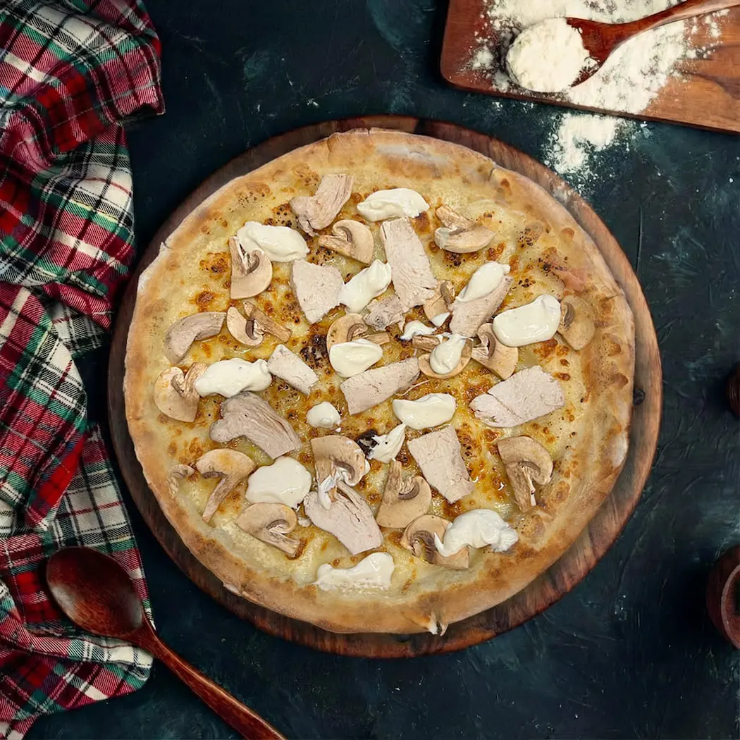 Mozzarella, poulet, champignons, emmental raffiné 18 mois, sauce Alfredo ( crème , parmesan, ail)
